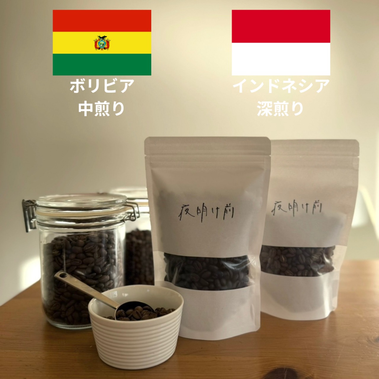 クリアなボリビアのコーヒーと、ビターなインドネシアの深煎りコーヒーが味わえます。